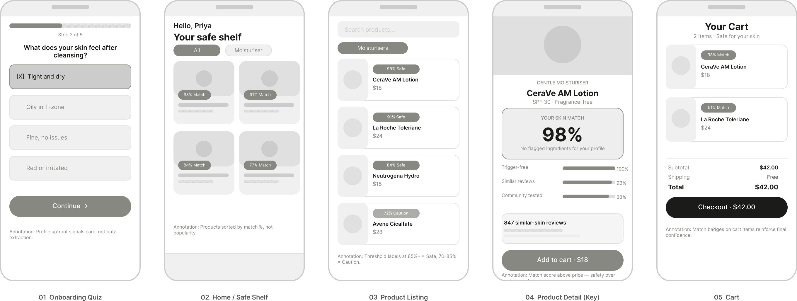 One thing I kept coming back to in the wireframe stage: the match score had to feel like it was for you, not just a generic rating. An 87% score needed to be legible as "this is 87% safe for Priya's skin", not "87 people out of 100 like this product." The breakdown into three sub-scores (trigger-free, similar reviews, community tested) was my answer to that.