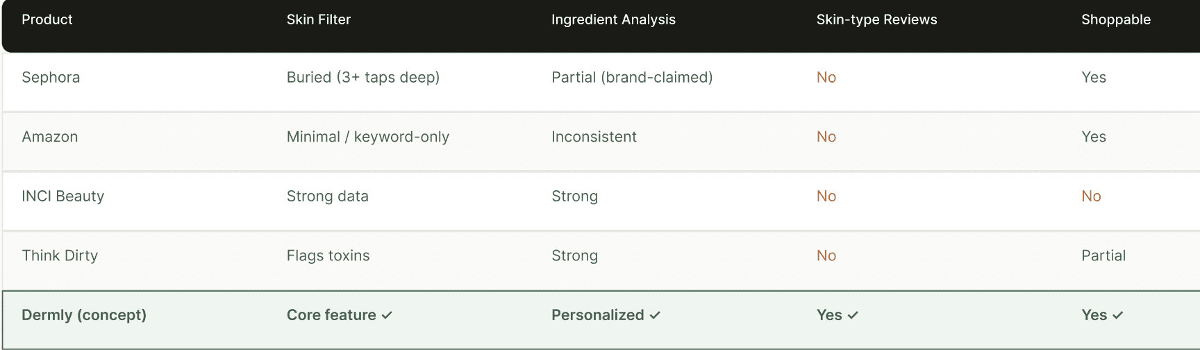 I started with secondary research, reading through skincare communities on Reddit (r/SkincareAddiction and r/SensitiveSkinCommunity have a combined ~3M members), looking at app store reviews for existing skincare apps and doing a competitor audit of 4 products: the Sephora app, Amazon, INCI Beauty and Think Dirty.
