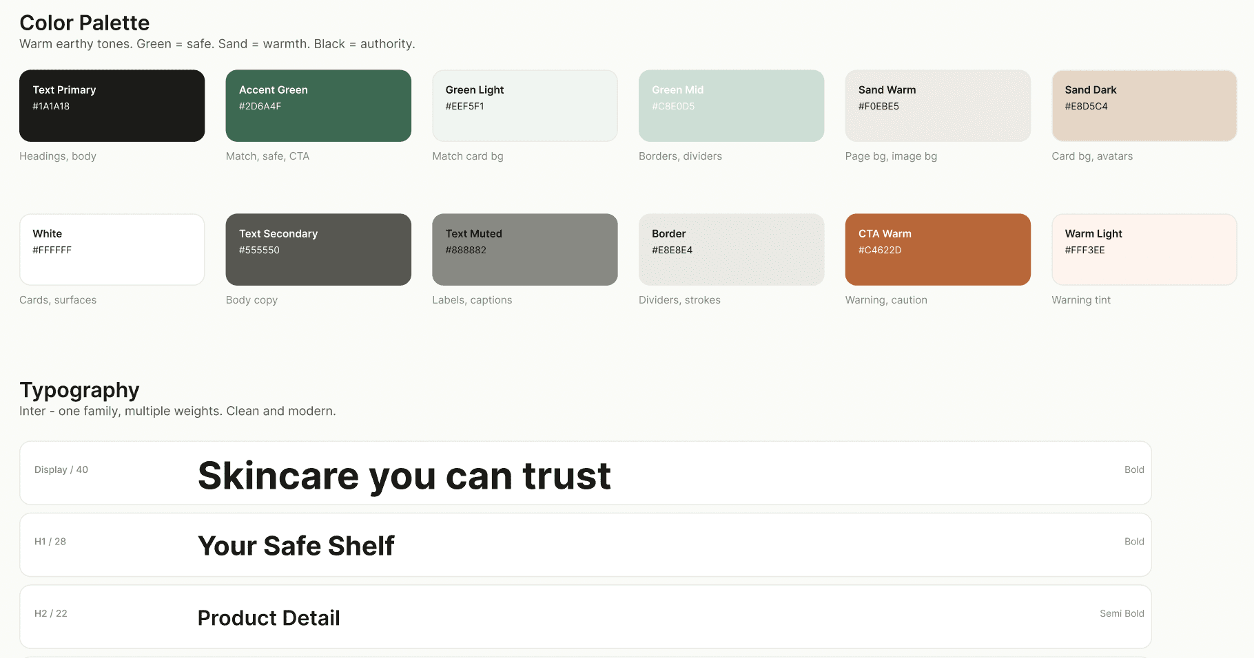 The visual direction was driven by one idea: skincare products for sensitive skin should feel safe, not clinical. Most skincare apps lean either medical-clean (white + blue, antiseptic) or luxury-aspirational (black + gold). I wanted something warmer - earthy, grounded, honest.