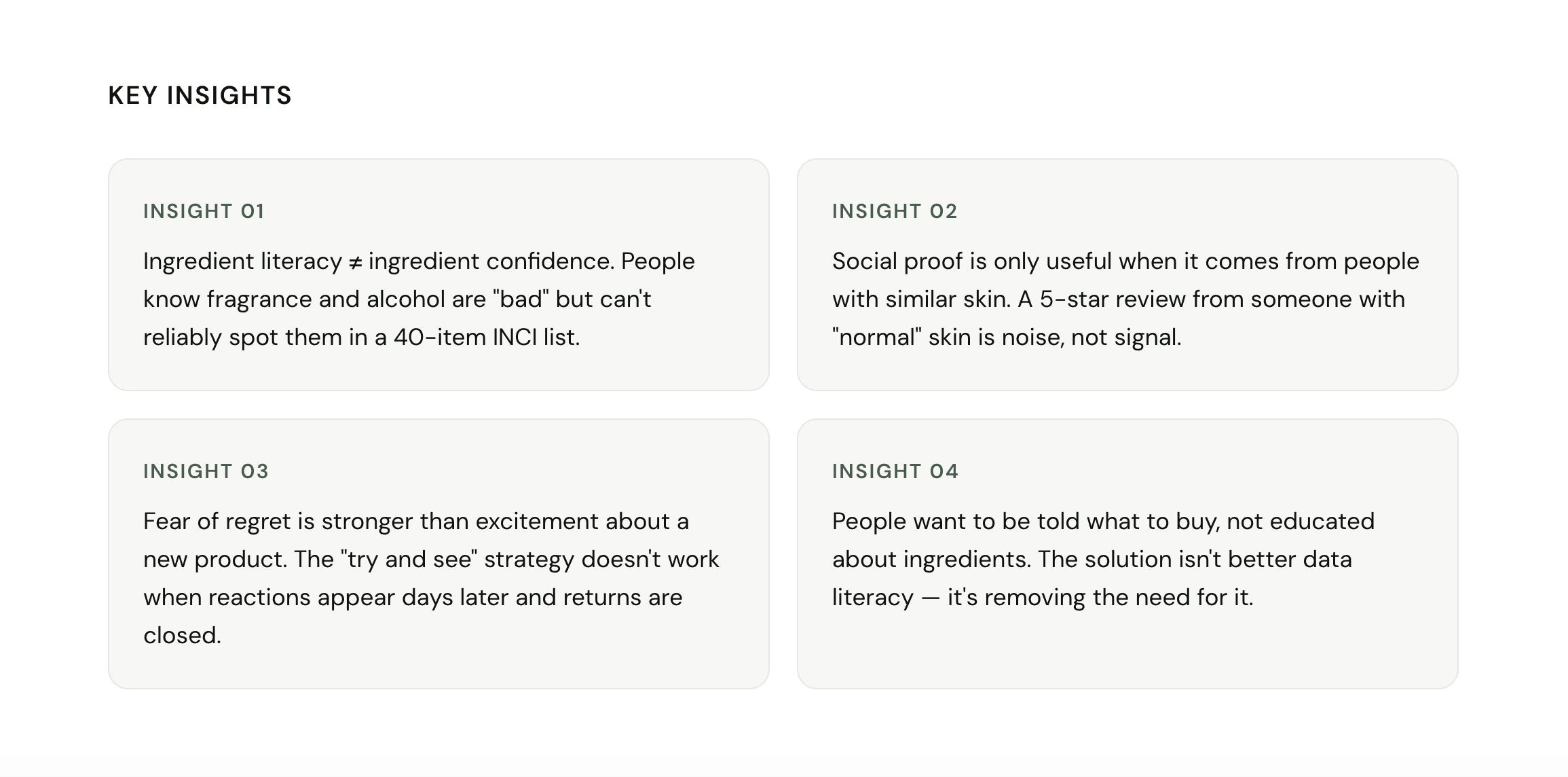 That became the question I wanted to answer: How might we help people with sensitive skin find products they can trust, without making them become skincare experts first?