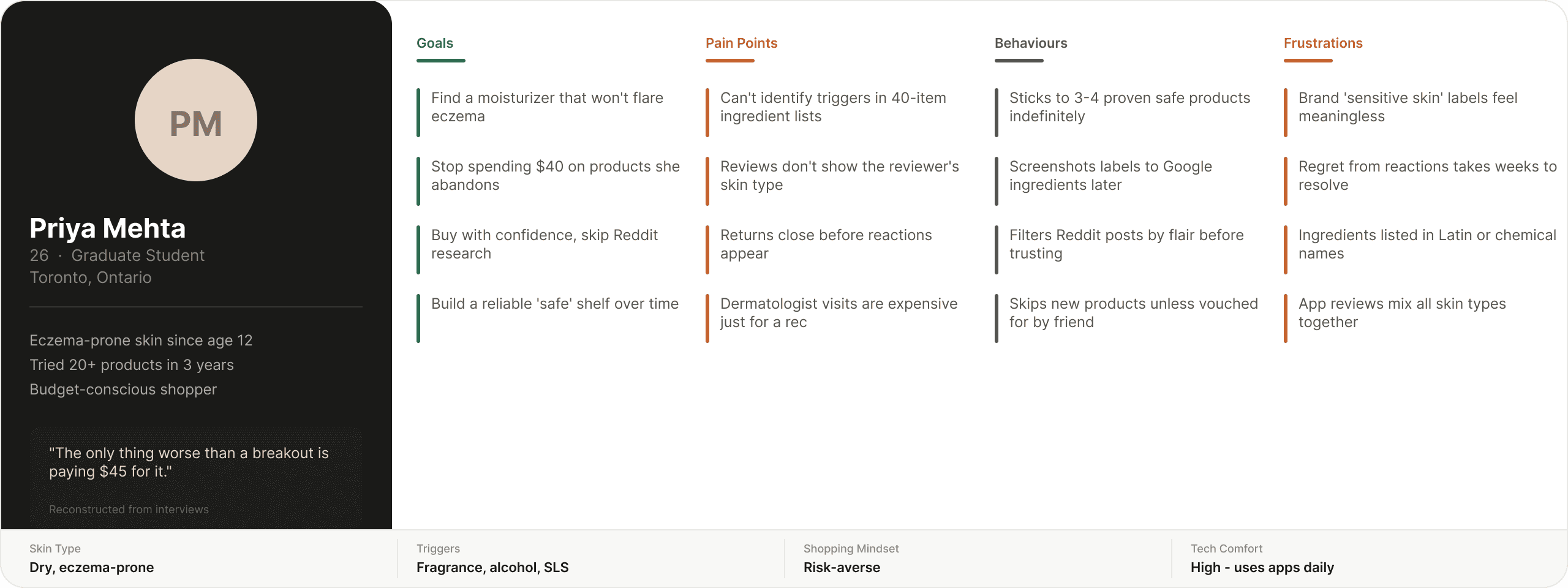 I also did 8 informal interviews with friends and classmates who identified as having some form of skin sensitivity (sensitive, eczema-prone, rosacea, or acne-prone). These weren't formal usability sessions, more like conversations over coffee where I asked them to walk me through their last skincare purchase. The patterns were pretty consistent.