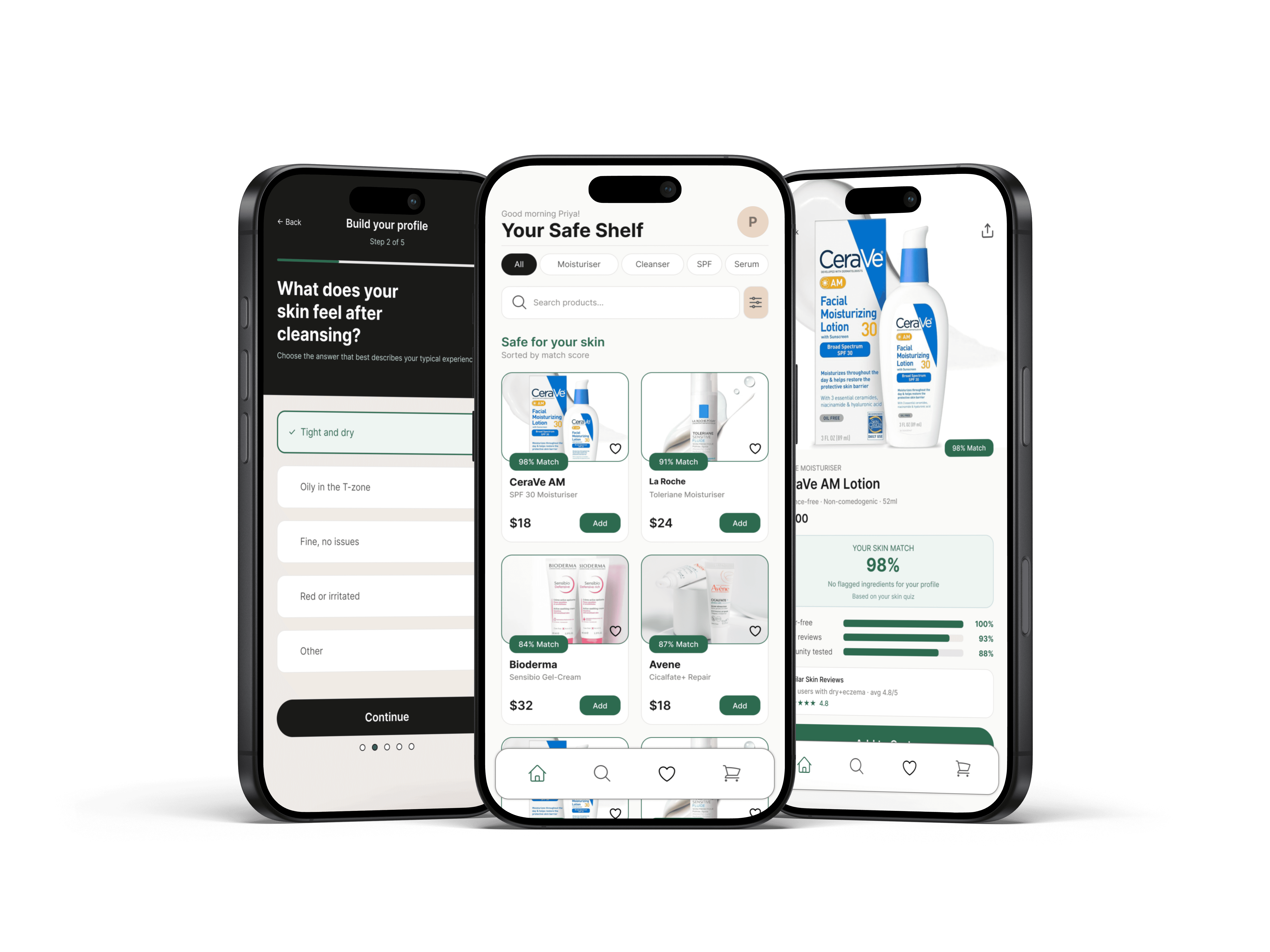 Match score concept landed immediately - 4 out of 5 participants understood what the score meant without me explaining it. The one who didn't was confused about whether 98% meant "98% of people like it" or "98% safe for you." That's a copy problem, not a concept problem. I added the sub-label "safe for your skin profile" after testing.