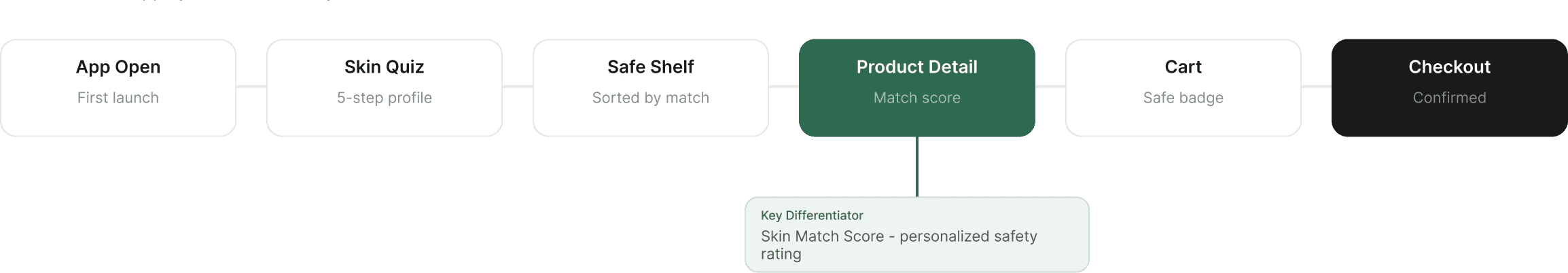 The highlighted step - Product Detail, is where the most design work happened. Getting the Skin Match Score right here was the whole point of the app. If that screen didn't work, nothing else mattered.